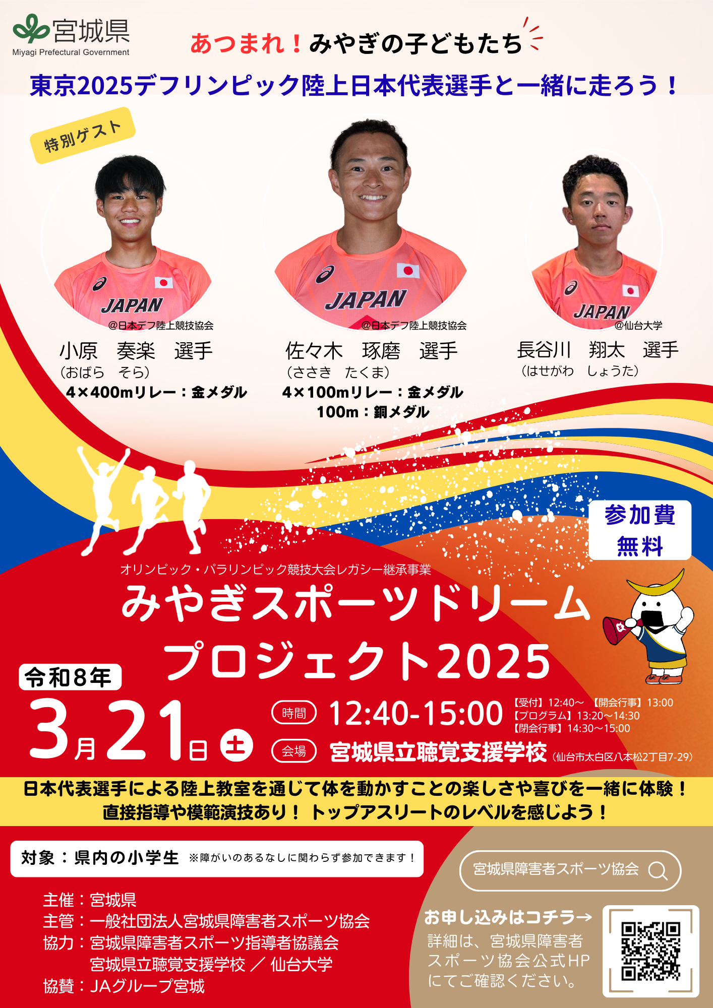 パラリンピックやデフリンピック等の国際大会で活躍した宮城県ゆかりのアスリート等と連携し、子どもの体力向上を推進するとともに、障害の有無に関わらず誰もがスポーツを楽しみ喜びを感じることができるインクルーシブなスポーツ交流機会を創出することで、障害者スポーツに関する関心と機運を醸成し、共生社会の実現を図ることを目的とした『みやぎスポーツドリームプロジェクト2025』を開催いたします。